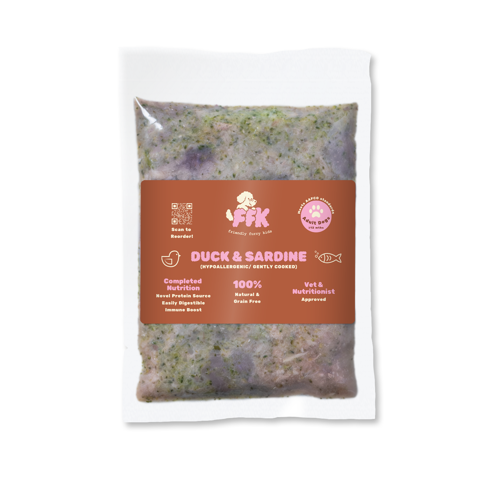 A hypoallergenic diet uses limited, novel protein sources (like duck, salmon or sardine) and avoids common allergens such as chicken, beef, or grains. It’s designed to reduce allergic reactions and support pets with food sensitivities, itchy skin, or sensitive digestion.