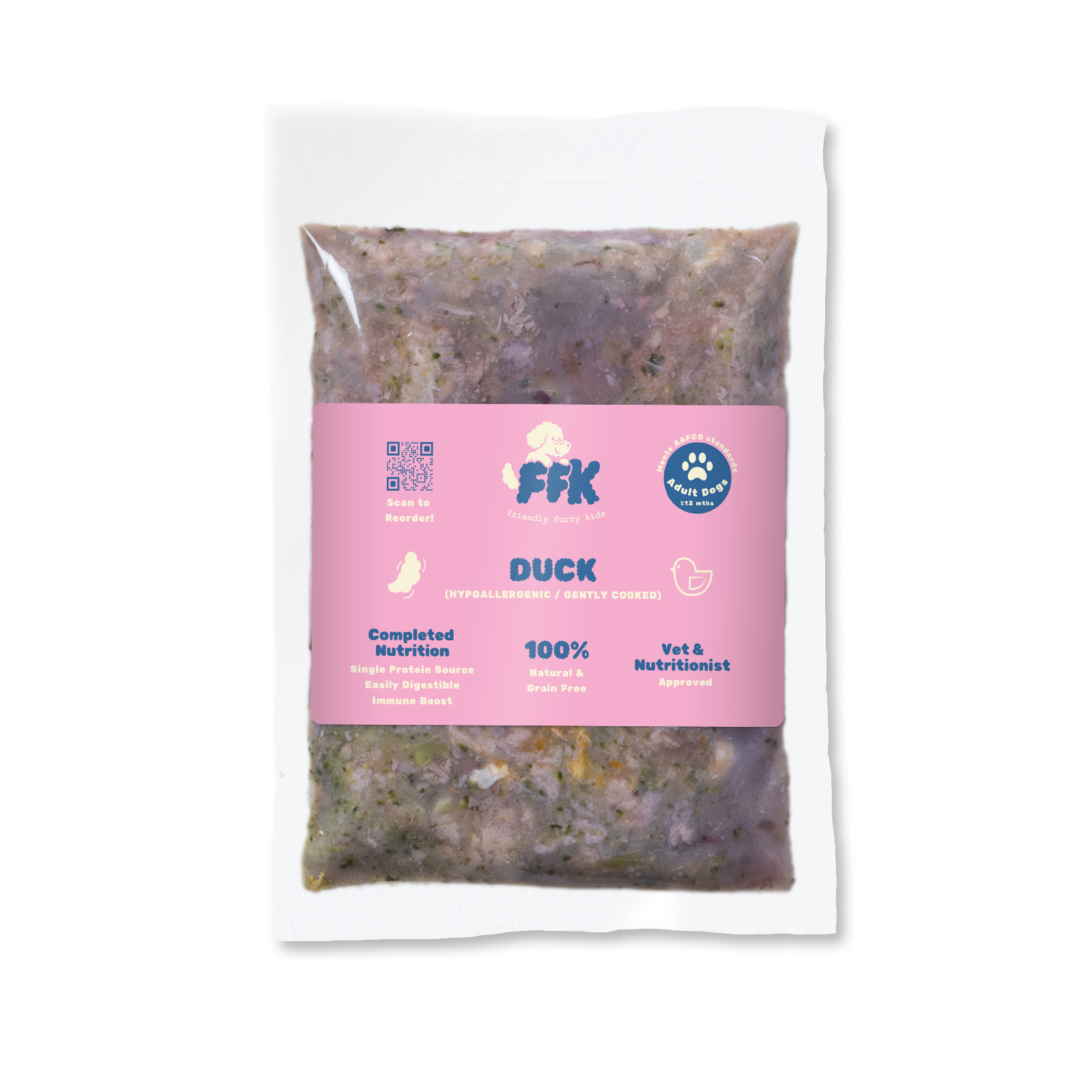 A gentle, tasty recipe featuring duck as a novel protein, perfect for adult dogs with sensitive tummies or food allergies. Packed with lean protein, low-GI veggies, and omega-rich oils, it supports healthy muscles, joints, and digestion while keeping coats soft and shiny.