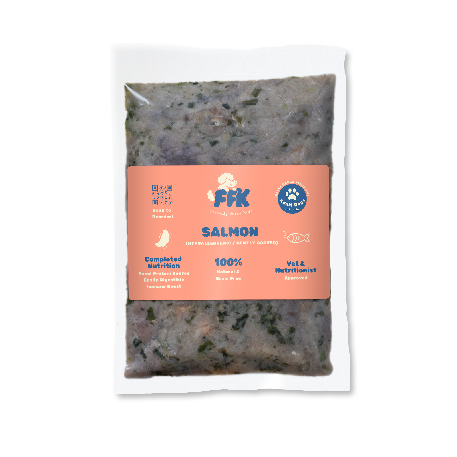 Hypoallergenic and omega-rich, this nourishing recipe features salmon as a key novel protein source, making it a gentle choice for dogs with food sensitivities. Packed with anti-inflammatory omega-3s, low-GI veggies, and essential nutrients, it supports healthy skin, digestion, and overall vitality.