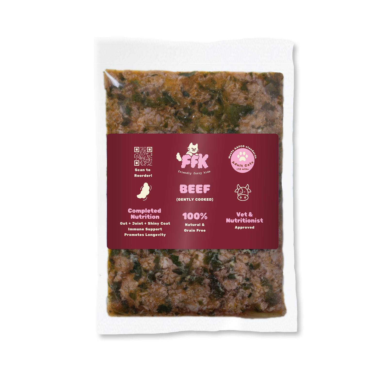 Made with nutrient-dense beef and organ meats, this hearty recipe is enriched with superfoods like pumpkin, spinach, and flaxseed oil to support muscle maintenance, digestive health, and a glossy coat. Perfectly balanced to meet the needs of adult cats, it promotes long-term wellness and vitality.