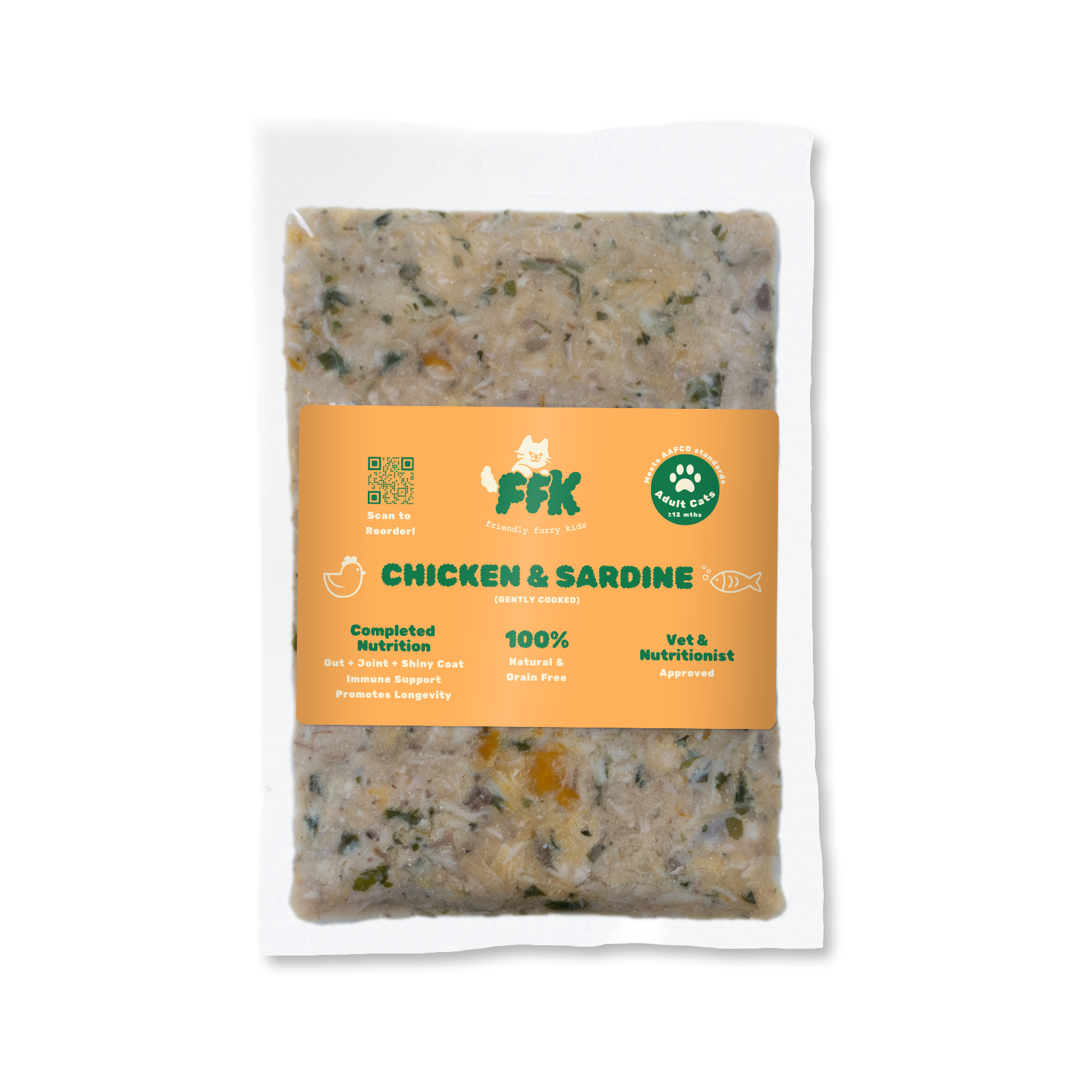 A flavourful fusion of land and sea, this recipe combines lean chicken with omega-rich sardines, fibre-rich veggies, and nourishing oils. Designed to maintain muscle health, promote smooth digestion, and enhance coat shine, it’s the perfect daily meal to keep adult cats happy and active.